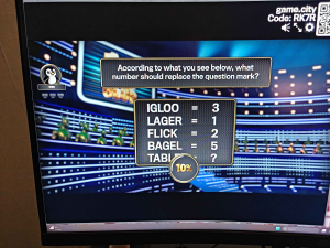 Which brings us to today’s release: The 1% Club. This plays an elided version of the show (90%, 70, 50, 40, 30, 20, 10 and 1%) and you get three lives in lieu of passes, although once you reach the 10% question you’re instantly eliminated if you’re wrong. It certainly looks and feels like The 1% Club with the graphics and music present and correct. It does not have Lee Mack, it has someone who sounds like Kerry Godliman voicing all the questions, and you’ll have to do your own crowd work. I have to say I thought the questions I encountered felt a bit chestnutty (which of these lines are longer? Oh they’re both the same!) and it’s a pity there doesn’t seem to be much spelling leeway in the typed questions, although at least if it wants a number from you it will go straight to number input. My own feeling is that the questions are a bit easier than you’d expect at the difficulties you’d see on the show, although if your friends are basically normal I don’t know how much that would matter, and with three lives your friends would have to be complete thickos not to get quite far through each eight question stack.