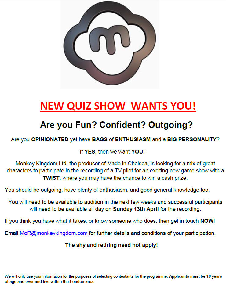 It was a bit like Blankety Blank. Two contestants answering questions, with five celebs (Gary Lineker, Hary Judd, Larry Lamb, Deborah Meaden, Sally Lindsay). One contestant then booted and the remaining plays for crap prizes like a breadmaker, chicken strimmer etc. Round one questions are like ‘In a survey, what is the most annoying thing on a plane…’ And in Round Two, the answers are numerical- celebrities answer and then an average is taken and the contestant has to decide whether its higher or lower. I.e how many arguments do the average couple have a week. It was funny and is a lot better than the BBC’s current Saturday night output. Would be very surprised if it wasn’t commissioned. The entire audience were in hysterics.