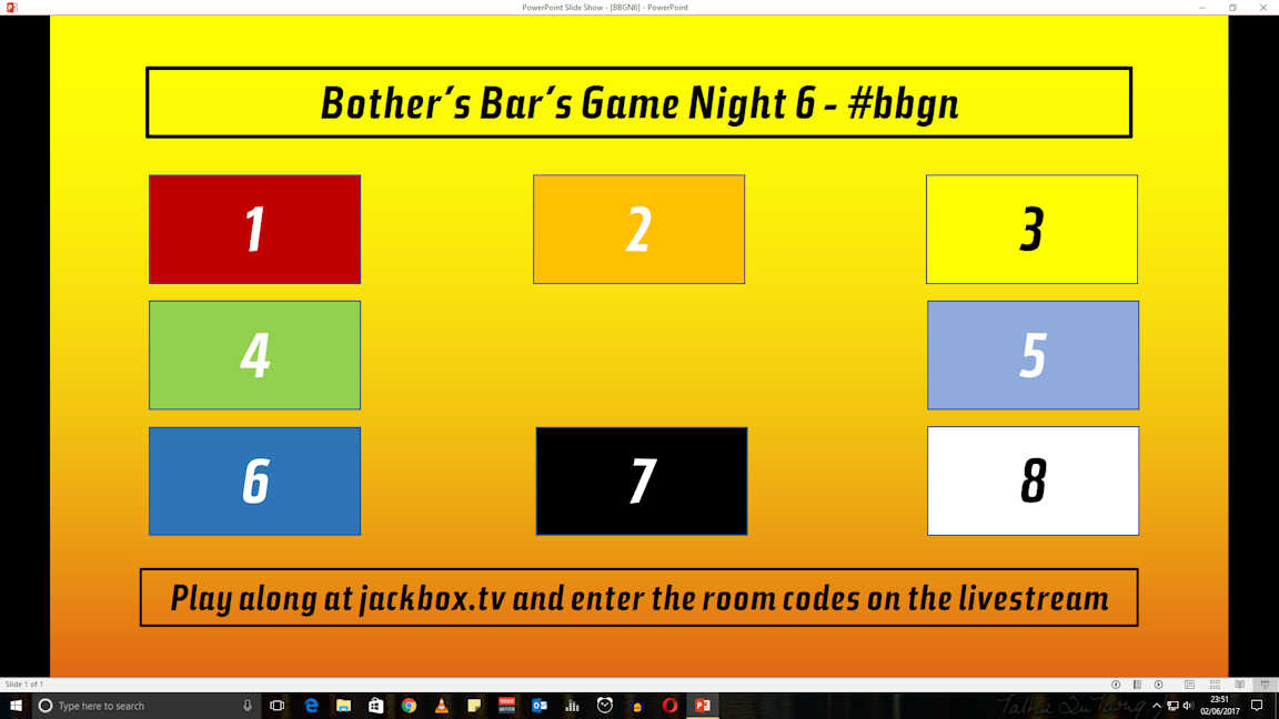 To play you will need to be watching on Youtube or on the stream here (we recommend watching through a computer as the delay is only a few seconds, but it can be rather longer watching on a smart TV) and on your second screen you log into jackbox.tv and follow the prompts. Keep an eye on your second screen as it’s likely to be a few seconds ahead of the action.