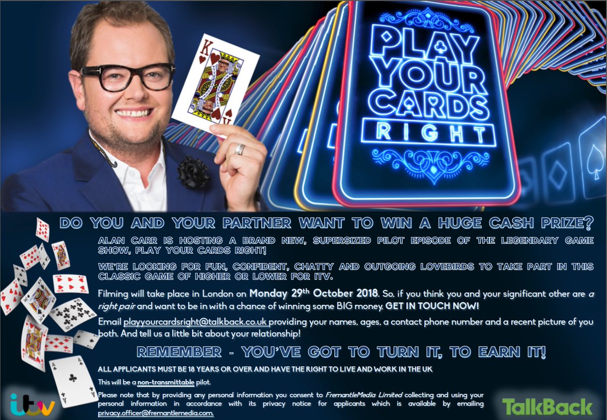 TL;DR they’re recording an episode of Play Your Cards Right on October 29th, it’s a non-transmittable pilot, couples can register interest by e-mailing playyourcardsright@talkback.co.uk with names, ages, contact number and a recent picture. Good luck!