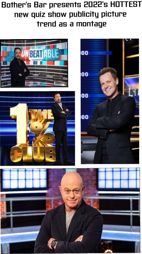 Anyway for the site’s birthday I hope for the continuation of 2022’s HOTTEST quiz show trend: quiz show hosts folding their arms for publicity photos, and if you don’t believe me you HAD BETTER BELIEVE I’ve created a montage to get value from my Adobe Creative Cloud license.