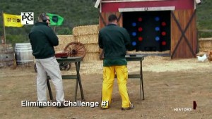 So season one nicely entertaining. It’s interesting that the first episode of season two suggests quite a different direction with people seemingly encouraged to bitch about each other more, but it did feature this challenge which looked like it took a while to set up – eight targets on ropes moving towards the shooter at different speeds. But also on each rope is a red “stopper”, and when the target reaches it it will drop out of play. The idea, obviously, it sot hit as many of the targets as possible before they all go. Not only a test of accuracy, but also of judgement.