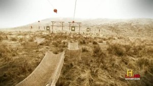It’s pretty by the numbers in terms of structure then but there are a few things that make this stand out a bit. How many different variations on shooting things can there be? It basically boils down to different guns, different targets, different distances. Yet within this fairly limited scope they’ve done quite well to keep the whole thing entertaining – the nature of the challenge is hidden from the players at practice so sometimes they’ll throw in things like memory (there’s usually some spurious reason like in the heat of battle it might mean the difference between hitting friend or foe or something like that) or balance (see picture above – teams must race to stick six targets in relay fashion with throwing knives whilst the ledges get increasingly perilous). One episode has contestants trying to recreate famous trick shots from history.