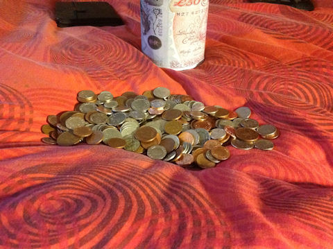 Now the question. It will cost £5.50 to enter this Sunday’s event at 8pm. How many times could I enter with all the change piled up there? The winner will be the person closest to the correct answer, ties broken by random draw. If you win you will have the option of me wiring the money across using Pokerstars, or PayPal. Entries close Friday midnight, winner and answer revealed Saturday. Good luck!
