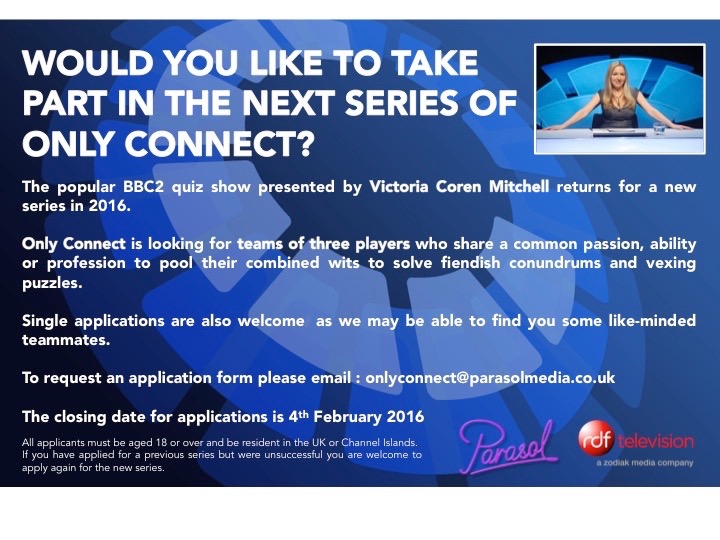 Long and short of it: singletons or teams of three can apply, Closing date is 4th February, e-mail onlyconnect@parasolmedia.co.uk for more details.