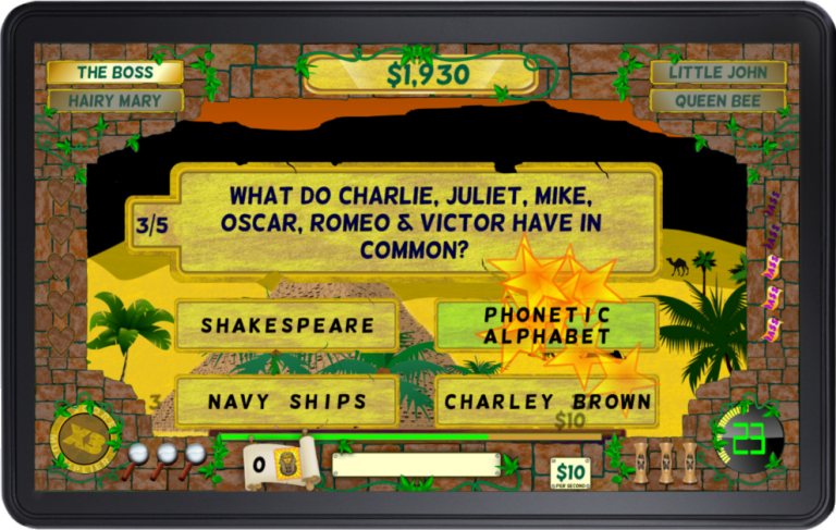 In Gameshow Adventure you are tasked with climbing pyramids (Aztec, Egypt, Vegas), each one with fifteen rooms and in each room a game. These are multi-choice quizzes (with varying rules regarding payoffs), conundrums (anagrams), catchphrases, a bonus wheel, various puzzles and the last room is basically Deal or No Deal for big points. At various points up the pyramid you can go to a shop to spend your winnings on extra lives, passes or to even play an arcade-y game to earn more money. And there’s a bonus game you can play between rooms.