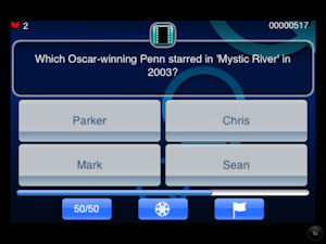 Indeed, if you’re looking for a ton of format variety you’ll be out of luck. The main modes have you either answering questions against the clock, or answering as many questions as you can with the help of three lifelines (50/50, freeze the clock, pass) before you get three answers wrong.  Points are gained for speed of response. Question level and time limits can be set before you play, and online leaderboards keep track of the main combinations.