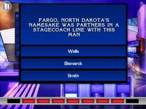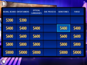 If you get the question correct you might hit a Daily Double, then you get to make a wager, which you can do by tapping a button in increments of $100 (tedious) or just go fro a true Daily Double (exciting yet excessive). Subtlety in wagering strategy destroyed in Final Jeopardy, which uses exactly the same system (so hope you don’t want to gamble 10,000k without it being your entire wodge, otherwise you might be there a while). Wagering questions are again multiple choice.