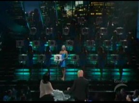 Howie requests the models to the stage. Each one is identically dressed, the colour of the dress changes from episode to episode.