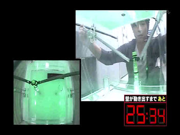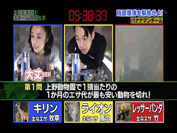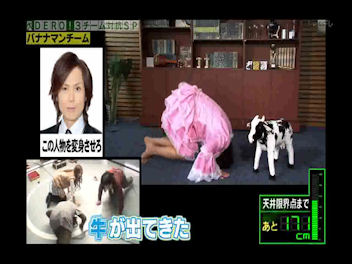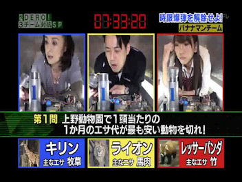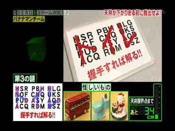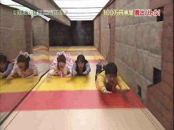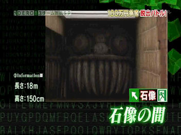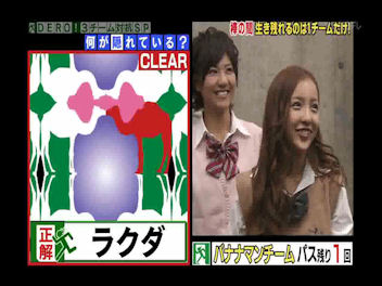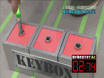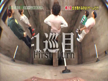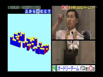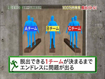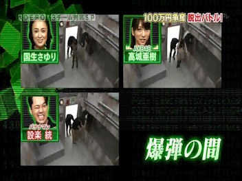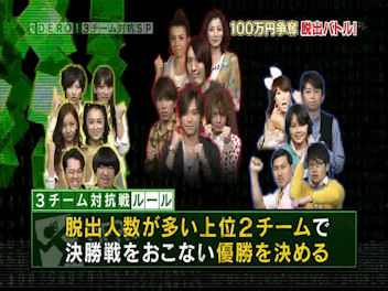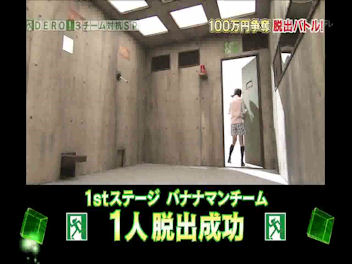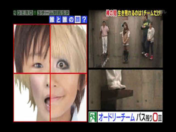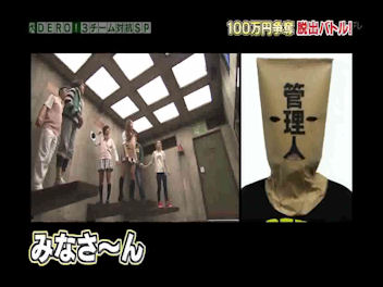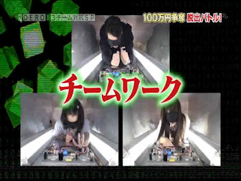 Also according to the Japanese Wikipedia, some bad news: the show was put on hiatus in the aftermath of the March earthquake and tsunami disaster. Apparently people didn’t want to see dark and tense stuff on TV immediately after such a terrible disaster, and I don’t blame them. However, the team behind DERO! quickly started work to revamp it into a new show, “Treasure Hunt Adventure: Puzzle Battle TORE!” which is basically the same show (right down to the same old regular contestants from DERO!) but more lighthearted and will apparently replace the Saw-like theme with something more like Indiana Jones. The premiere is next Wednesday (July 6) with a 2-hour special and it’ll have DERO!’s old timeslot.
