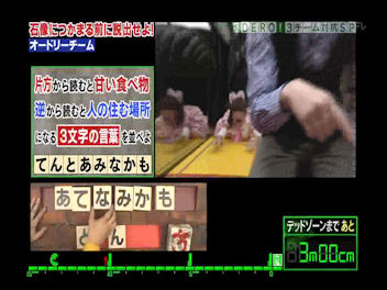 The contestants are given a scroll with “修理消すもん” and a small message prompting them to hit the button, which triggers a sumo-referee puppet to come out and prompt them to engage in a sumo match. Then it asks them, “what did you do just now?” The answer is “have a sumo match” (“すもうをとって”). In a Japanese pun, this can also be interpreted as “take out sumo” (written exactly the same, even if you’re using kanji). I actually had to look this one up – turns out the Japanese verb for “to take” is also used in sumo jargon for “to have a match”.