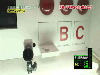 In this one the contestants are manacled to the wall and the ceiling begins at 3m and apparently drops 1cm every three seconds (although close inspection suggests that whilst the graphics give an indication of the time limit, the celiling won’t drop past a point the players can’t complete a puzzle by the looks of things). Lots of different objects around the room and three boxes. In this first puzzle the contestants must play sumo (the box out on the right features a puppet sumo referee). This leads to a clue.
