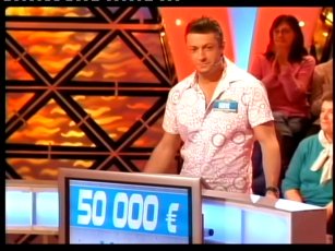 Now, we’re a bit unsure as to what happens if he doesn’t. We think we’ve read that four answers wins 2,000 Euros and the right to come back the next day, anything else is thankyou but goodbye.