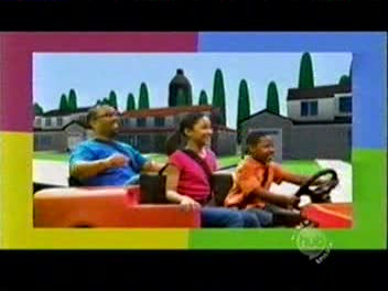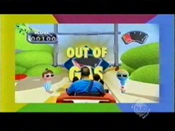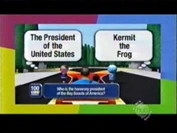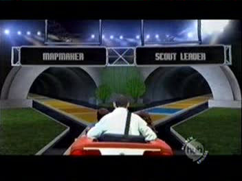 Along the way the road forks with a question. If you can’t read that, the question is “who is the honoury president of the Boy Scouts of America?” The team selects an answer by turning the steering wheel in one way or the other. It’s the President, by the way.