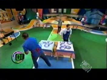 And throws it to the third teammate who must catch it on the plate and put it on the table. Dropped burgers don’t count. Each completed burger is worth 250 lifepoints.