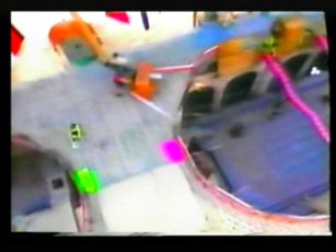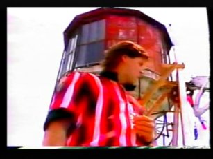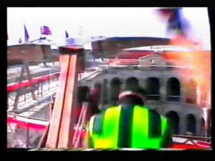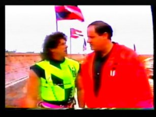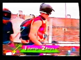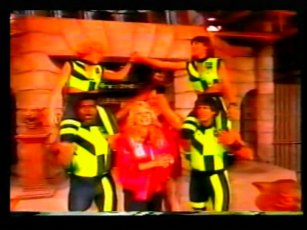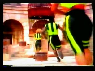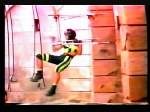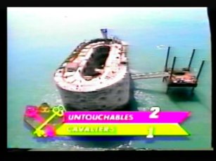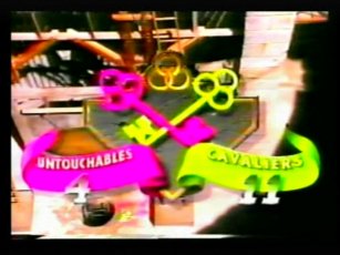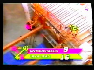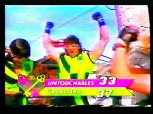 The team in flourescent purple are "The Untouchables", in the yellow, "The Cavaliers". The leader of The Cavaliers is Rico Costantino, a law enforcer at the time of filming, nowadays a top WWE wrestler. He had also become a star thanks to some appearences in American Gladiators previous.