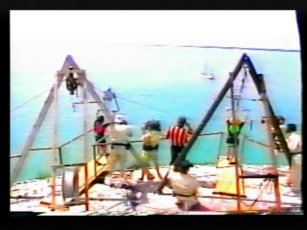 After a quick montage of the show ahead, punctuated by a few horns, we are introduced to our hosts currently flying above the fort in a helicopter. This is sportscaster Chris Berman and the actress Cathy Lee Crosby. There are 13 different challenges, the most demanding physical and psychological challenges ever attempted on television.