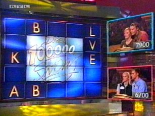 The contestants are asked first on the buzzer questions worth 500DM each. The first letter of each answer is put on the wall. The letters can be read round the sqaure to form a word or words. After they’ve answered a question correctly, they can offer an answer to the puzzle if they think they have one.
