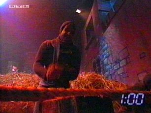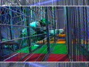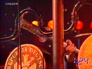 Our broken German suggests that inside each of the five weights is a cash prize worth between 1,000DM and 10,000DM. The contestants have up to five questions. Every time they get one right they can pick a weight to pull up. However, if whilst pulling up the weights the metally bits touch the side of the hole then they have to drop it.