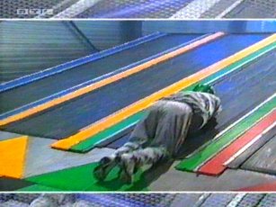 This involves climbing up a rope net and then traversing a wire bridge on two planks of wood, then clmabering through the wire mesh maze (pictured), followed by running up a travelator. At the end of the travelator they jump down and sprint towards some mobile scaffold. They drag it back to the end of the travelator and hit a button.