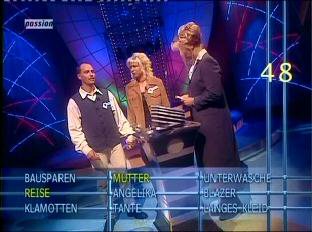 The couple get up to three attempts to knock all ten pins down, and it looks as though two is the maximum bowls either can take. If the couple get a strike they win 30,000 DM (about £10k). If it takes them a second attempt to knock the rest over it’s worth 20,000 DM, and the third and final chance needs using it’s worth 10,000 DM. Unfortunately this couple fail to knock them all over, but they’re given their wedding clothes for their troubles as well as a very impressive looking dinner set for twelve people.