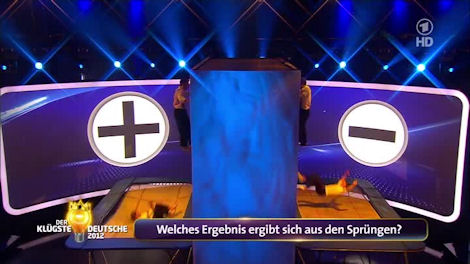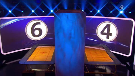 The next game involves the Cosmic Artists of Berlin. They are going to bounce on trmapolines, contestants should add 1 to the total for every bounce on the left and subtract one for every bounce on the right. They will type their answers in.