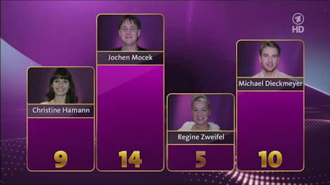 Jochen is the clear winner with 14 leaderboard points and is straight through to the live final the next week. With only 5 points Regine has to leave the show. Christine and Michael will have to wait until later to find out their fate.