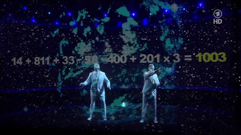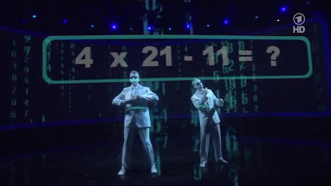 This is the Elektric Dance Theatre (my attempt as spelling) from Frankfurt. They come on and do a neat routine with a see-through screen that adds planes of depth. Their game involves maths though, they bring up a multi-part sum and the contestants have 10 seconds to type in their answer. It’s important to remember your BODMAS!