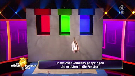 Tonight’s final game concerns the return of the trampolining Cosmic Artists of Berlin. The performers are going to bounce in and out of windows, the contestants have to remember the order the performers land on a coloured window.