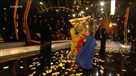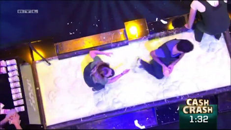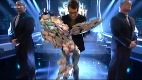 And this is what it’s all about. Hanging from the ceiling are three tubes and periodically money (now NOT in bundles) will pour out of each one. Simply, the team must catch as much money as they can, because whatever they catch they will keep. It’s quite good fun, but you’ll note how much is strewn across the floor – and if it’s on the floor, it’s out of the game.
