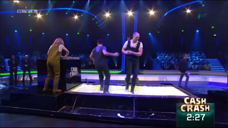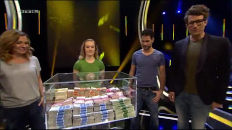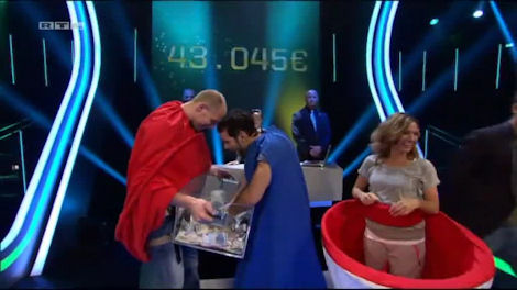 And the contestants miss it. Happily in this instance it was just a pile of €500 bundles. They have one catcher between them.