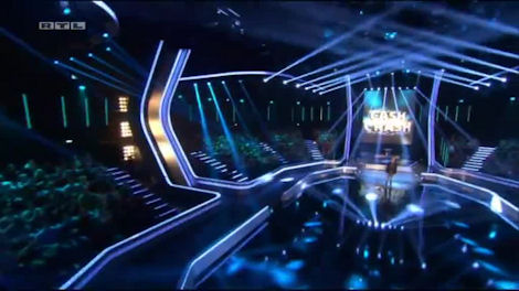 The Cash Crash arena. Futuristic rather than dark I would suggest, although from this angle it does look a little bit like the Millionaire set but elongated a bit.