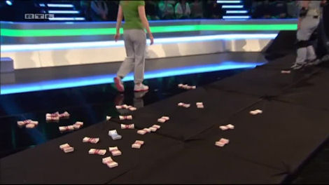 The team must get the money from the pedestal to the box in chain fashion, and the guy at the end has to throw the money in the box whilst the wheel is moving, making it doubly hard. The joker for this game is a tupperware-style box for the price of €1,000. They decline.
