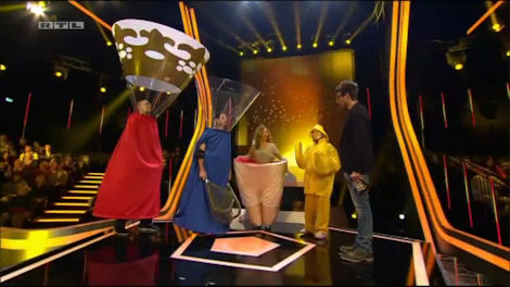 And in the final the contestants are dressed slightly ridiculously. One is wearing waterproofs and a large hand and all covered in glue the least useful in terms of catching money, but the most mobile), the second is wearing large pants (good for catching money, but difficult to walk in), the player in blue is wearing a funnel on his head and has a catching net, and the King is wearing a large funnel, but the crown obscures his vision somewhat.