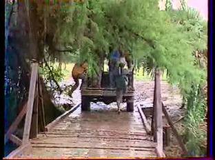 Meanwhile back on the trail, they’ve hit another snag, there’s a large bit of bridge missing and just floating in the middle of the water. Would the team be so kind as to retreive it and fix the bridge?
