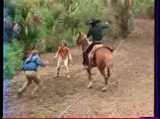 The contestant must untie the rope without getting lassoed – if he does, he can’t defend his quiver. By using the clever tactics of staying quite close to the horse, hiding behind the tree and keeping to the ground he actually succeeds here and so is allowed to continue on the quest. At one point he did get caught, but managed to slip out of the noose before the Black Knight tightened his grip!
