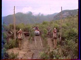 We’ve reached a fork in the road and the way is blocked by these guardians, trying to hold a wooden spiked block across the trail in place so that the jeep cannot pass without ruining the tires.