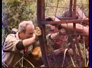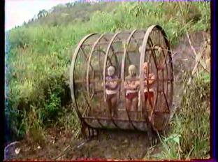 Another fork in the road, and here the trail is blocked by three guardians inside a rolling steel cage. The object is for the team to push them up the hill and out of the way.