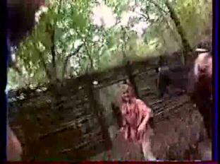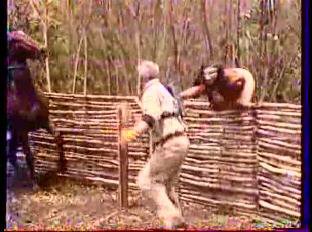 And so they must go around the other direction, and one must face an eliminatory individual challenge. How they decide who gets to go and play I don’t know. Here there is a large rope across the trail, it’s up to one of the contestants to go into the clearing and release the rope. But this is made more difficult by (da-da-daaaa!) the Black Knight and his Guardian friend who lie in wait to try and eliminate the contestant.