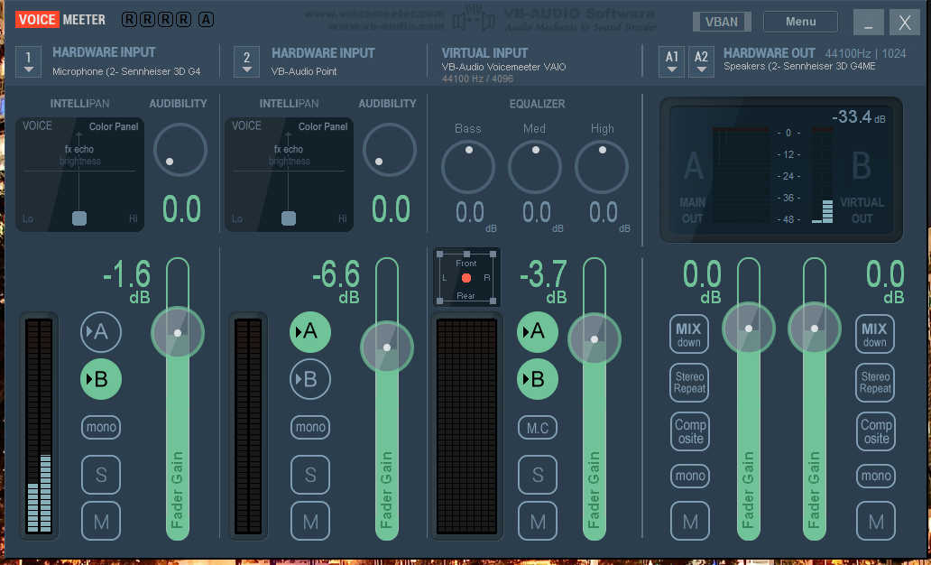 You can experiment with the fader levels. You can save these settings for future use in the menu. Do a quick test if you like, if you play a game or a tune and the Virtual Input bars are going up and down then you’re there. If they’re not doing anything make sure you’ve set VoiceMeeter to Default in your Sound Control Panel.