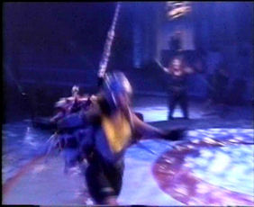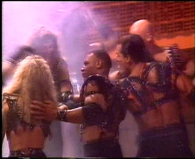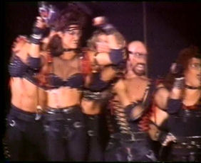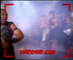 Yes, Vixxen’s USP was the fact they gave her a giant whip… So, during the Warriors entrance into the arena in this same episode, she broke free from the others after they did the whole hands-in thing, cracked the whip and made the claw-hand to the camera. In other words, for one night only Vixxen stole the spotlight from Pyro with his whole lighting of the Ring of Fire (not such an unwelcome break from tradition either) etc. She didn’t do anything an elaborate in her second appearance though.