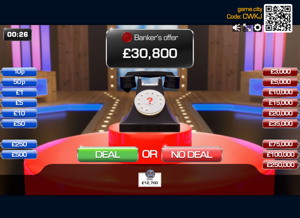 Something I’m not sure I can recommend is game.city’s Jackbox style interpretation of Deal or No Deal for £15. It’s got (the voice of) Noel. You can play on your phone, but it’s pretty slow, when I was playtesting it when £20,000 was the top box and I knocked out Noel said “that’s OK!” But what makes it really annoying to play is that apparently it has a Banker even more generous than the ITV one. £30k in Round one! Also it might be quite fun if there was an option if you play multiple games to keep everyone’s scores and decisions a secret but have a ranking, to encourage a bit of bluff.
