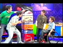 The first real stamp of Dick and Dom is reserved for the first person to buzz in and get a question wrong, whereby the voiceover laughs at them, declares them to be a silly ass and instructs them to put their ass mask on. The original Ask the Family was a gentle and cozy affair where you could imagine breaks in the recording for tea and cake. Not so here (apart from the cake, more of which later). What follows is a number of set rounds, normally a sound effects round, a close-up picture round, a rebus round (work out the name of the celebrity from the pictures), a classic Ask the Family clip round (hosted by what seems to be a parody of child prodigy James Harries, because he's an obvious target for satire) to see if the families of today are as clever as the families of yesteryear (no, usually), a game where the kids have to place things in a certain order (one of the things being one of their family), working out which two celebrities could have made a baby from the picture given and a seemingly random game unique to each programme (making a model head of a celebrity, creating equations with topless men, a memory test where the objects were held in trays by sexy dancing women, that sort of thing). Between rounds the voiceover man declares scores (normally commenting "ha ha ha ha! Rubbish." after reading out the losing team's score).