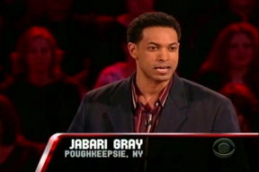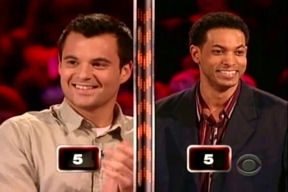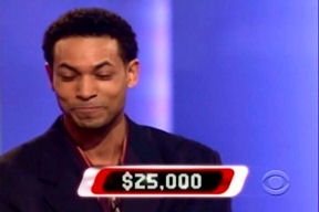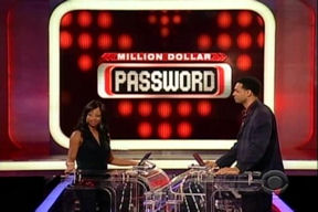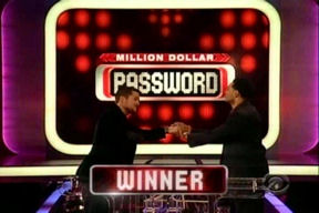 Here's the opponent. The principles of the game of Password are pretty much unchanged in the intervening twenty years, but the rules have changed. The game begins with the elimination round - two people enter, one goes home. The winner gets to play for a million dollars. |