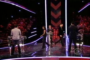 The contestants at their podiums. Each episode features two celebrities who play throughout the entire show. Each show features two games, each played by two different civilian contestants. Through the magic of editing, we'll actually be using the second of this episode's games for our feature. |