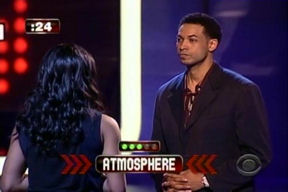 Going for $100k now and having just got "inaugruation" he's in a bit of a pickle - 24 seconds left, no passes and just three words to convey "atmosphere". |